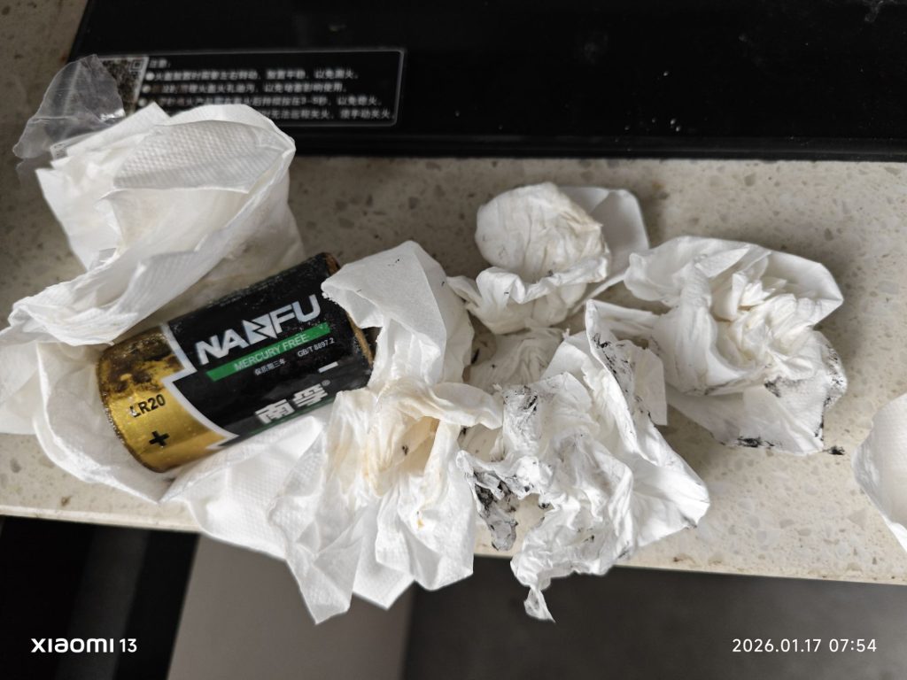 老丈人的燃气灶点不着火了,肯定是电池问题吧,于是我买了南孚丰兰1号电池去换,当我拆开的时候发现电池都烂了,滴水,里面居然也是一节南孚的。