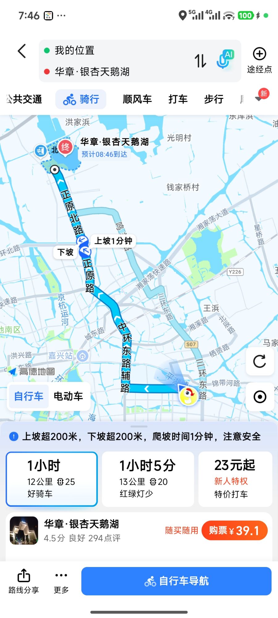 导航一下,12公里,1个小时,我导航也太小看我了吧,12公里还用得着骑一个小时?时速12码,我之前骑车好像20多码是正常的,努努力能达到30+的呀,我就没考虑到我这次骑的是公共自行车,也对自己的实力太盲目的相信了,骑到一半就啪啪打脸,真叫累,不过最终在58分钟左右到达目的的,58分也刚好不用花钱。