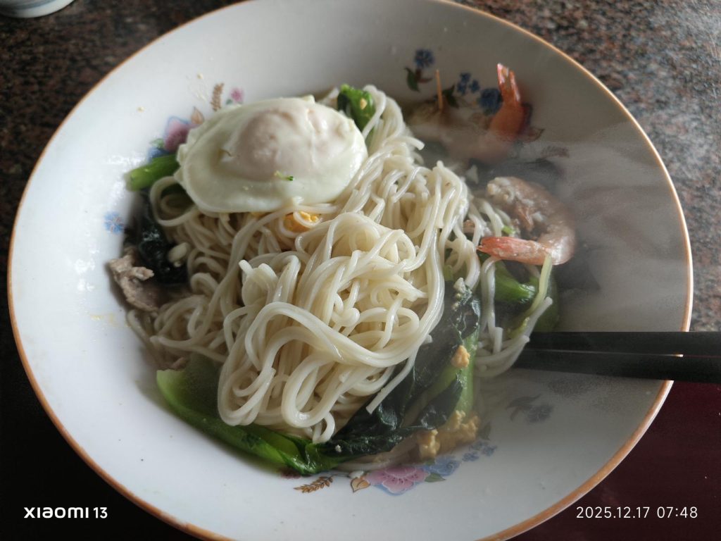 昨天跟老妈打过招呼,今天我跟她一起吃碗生日面,早晨7点半,就打了个电话给老妈,然后去老妈那边,面已经准备好了,虾、肉片、青菜再加两个蛋,我想好好拍张照,但是老妈总是把面条放碗里后挑一挑,把面条挑在上面,我想放放整齐,又怕老妈笑话我,算了就这样吧。