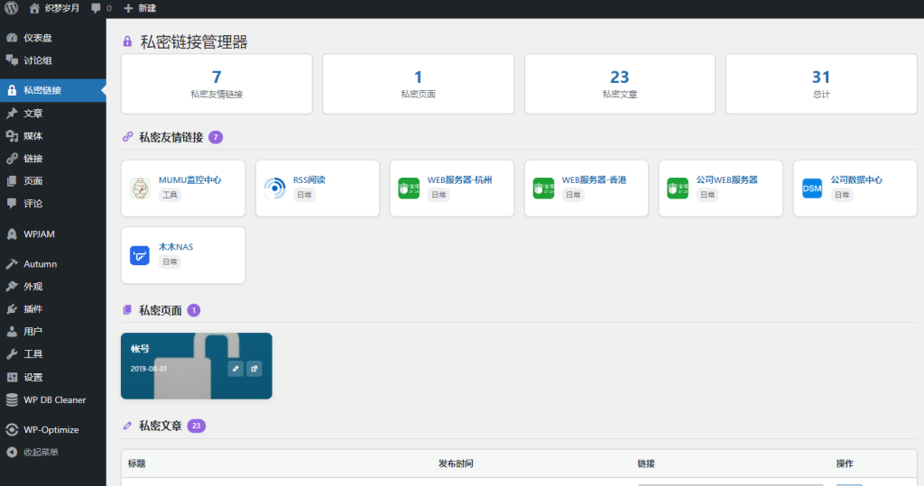 这次吧,不知道咋回事,忽然想在后台弄一个私密链接,于是就有了这个东西,我把我的几个常用的网址放进了链接里,设为私密,特别是宝塔的,URL里有一些数字,记不住,那就放这里,我把私密的展现出来,密码呢,本来我手机里安装了bitwarden的,但密码都是不规则的,很长很难肯定是记不住的,我打开bitwarden手打进去太麻烦了,最好让我直接复制,那也好办,我弄了个私密页面,取名帐号,把帐号密码放这里,请问大佬们,这样会不会不安全?再往下,就是一些私密的文章。