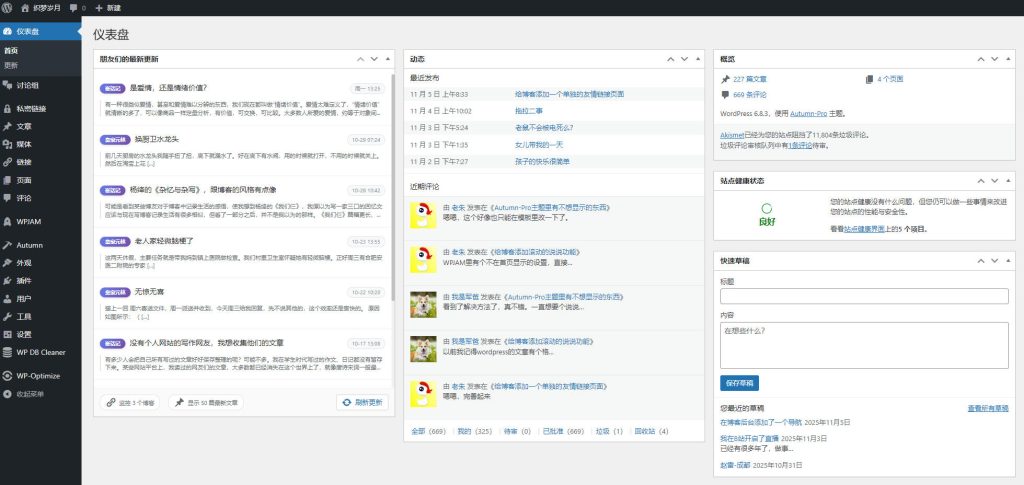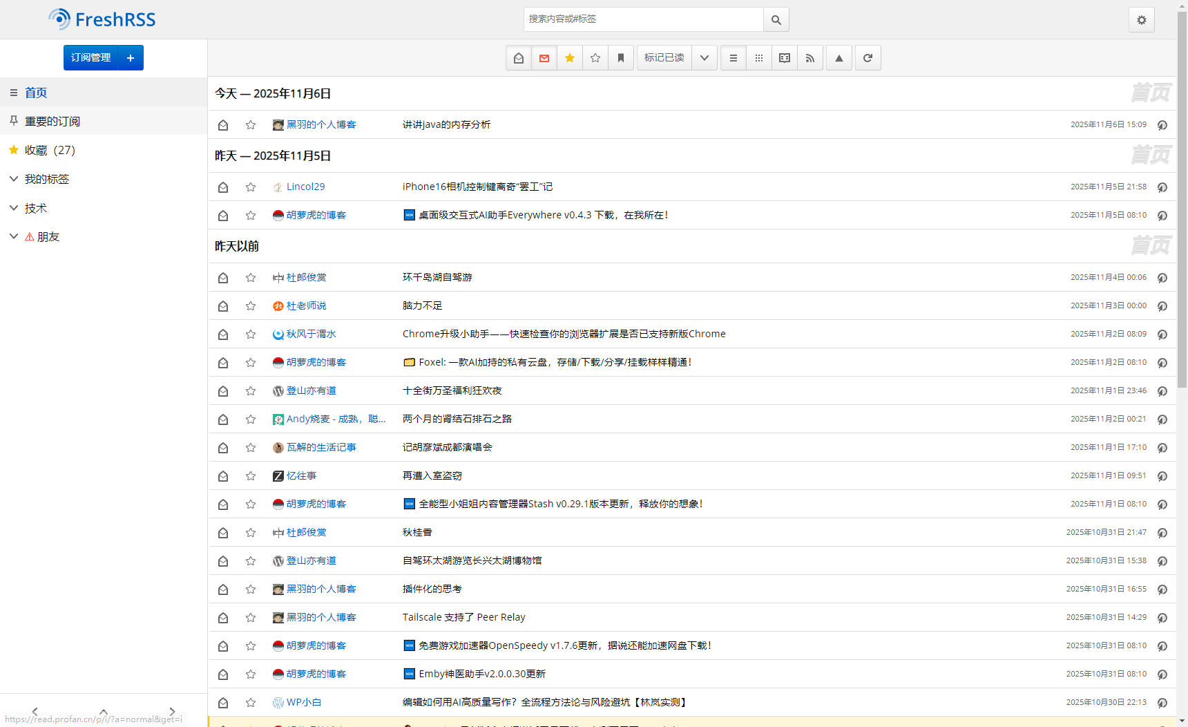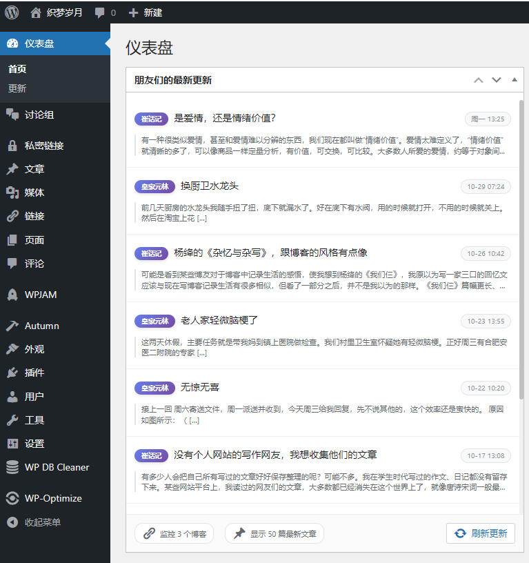 平时我看朋友们的博客,是通过FreshRSS的,在本地安装了一个FreshRSS的网站,订阅了一些朋友们的博客,看看他们的日常和分享,最近几天在折腾我的博客,前面刚弄了个友链的单页,添加了一位朋友,忽然想,既然有链接,我是不是可以直接在我的博客后台里看他们有没有更新。