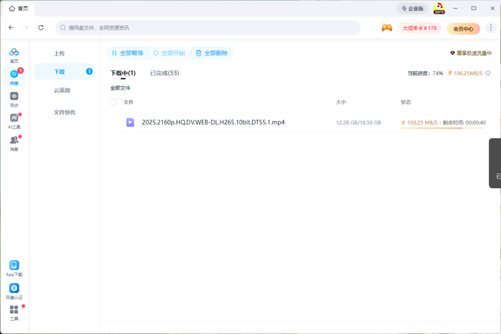 这是开了会员吧?好像夸克也可以,而且夸克PDD买个88VIP,平时下载也能在30左右,挺划算的